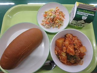 鶏肉とかぶのトマト煮、とってもおいしかったです。おかわりをする子がたくさんいました。持久走記録会でいっぱい頑張ったあとだったので、いつもよりお残しも少なかったように思います。ごちそうさまでした!(3B)