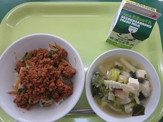 ビビンバは大喜びで食べていました。野菜が苦手な子も、肉みその味で食べやすかったようです。若竹スープは苦手な具がある子が多かったですが、具だくさんでおいしかったです。ごちそうさまでした!(1C)