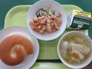 鶏肉のから揚げは大人気でした。子どもたちからは「からあげ~やった~!」「今日が2年生最後の給食か・・・」などの声がありました。みんなとてもおいしそうに食べていました。おいしい給食をありがとうございました!(2B)