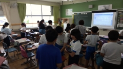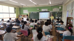 2時間目は5Aが外国語、5Bが体育の時間でした。5Aは教室でHEFの先生と一緒に外国語を学習していました。今日のめあては、「Can you ~?」の文型を使って友達に質問し、何ができるかできないかを知ることです。「Can you play basketball?」と聞いて「Yes,I can.」が答えの場合は、タブレットの図のYESコーナーにカードを貼っていきます。今日は、いろいろな友達と繰り返し、会話の練習をしていきました。 5Bは視聴覚室で組体操の練習です。今日は幾分過ごしやすい日でしたが、熱中症防止のためエアコンの効いた部屋で組体操の練習です。3人から4人組で扇の技にチャレンジしていました。曲に合わせて一斉に扇形になったり、前から順番にリズムよく扇形になるなど、とてもテンポよく技ができていました。
