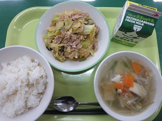 とても寒い一日だったので、ワンタンスープがとてもおいしく感じられました。豚キムチはごはんにとてもよく合い、おかわりをする子がとても多かったです。欠席児童が多かったですが、豚キムチとごはんは売り切れました。(3B)