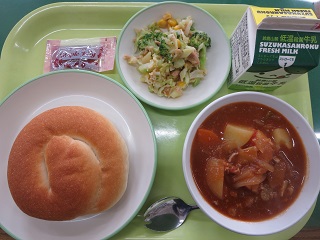 ポークシチューはとても人気でした!パンを減らす子が多かったですが、メープルジャムがあったので完食できました。(5B)