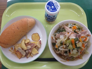 ラーメンもベジタブルチップスも人気で完食しました。子どもたちはラーメンが大好きですね!ごちそうさまでした。(4A)