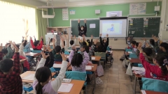 廊下まで楽しそうな声が聞こえてきたので、教室をのぞいてみるとHEFの先生との英語の授業でした。代表4人が前に出てきて、自分の持っている絵カードを一斉に発音します。他の子たちは、その発音を聞き取り、誰が何をいっているかあてるゲームです。「What’s this?」「 It's a  peach.」「 That's rigt! 」  とキーセンテンスをきちんと発話することができていました。ゲームを通して、自然に英語に慣れ親しんでいくことが大切です。