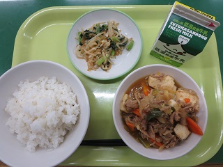 肉豆腐は肌寒い日にぴったりのメニューですね!ご飯がすすみました。3年生で大豆の授業をしていただいたこともあり「豆腐や!」と反応していました。ごちそうさまでした。(3A)