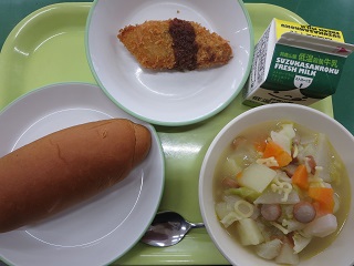 2限目にはお腹が空いたという子もいて、給食をとても楽しみにしているようです。野菜は苦手な子が多く、ポトフは残す子がでてしまいました。ごちそうさまでした。(1B)