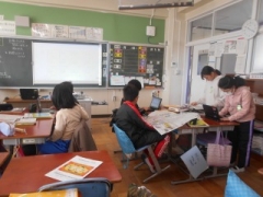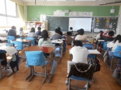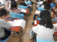 ★1年生の教室では、国語『おとうとねずみチロ』を学習していました。おばあちゃんからのチョッキを楽しみに待つ、3匹のねずみの様子について考えていました。教科書の内容を読み取ってワークシートに書いていきました。わからないことがあると「教えて」「わからない」と自分で言えるクラスの雰囲気が良いなと思いました。