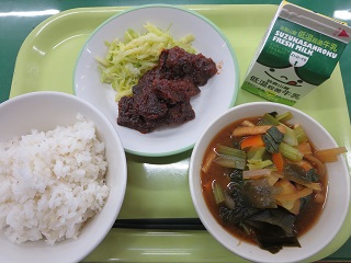 くじらを食べることに対する抵抗があり、最初は減らす子が多かったです。一口食べると「くじらおいしいやん!」という声があがり完食することができました。ごちそうさまでした!(4C)