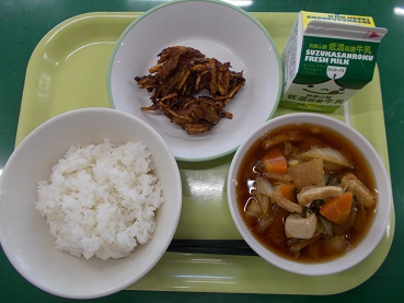 「寒い日は温かいみそ汁がしみる~」と言ってとても人気でした。かきあげはいつも人気ですが、たくさん入っていたのでおかわりをすることができました。ごちそうさまでした。(5A)