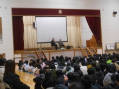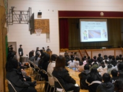 地域の方に作っていただいた『内部小学校の150年の歴史』の映像を見たり、本校を卒業された地域在住のお二人から『むかしの内部小学校』の生活の様子を語っていただいたり、6年生が『内部の未来』を発表したり・・・