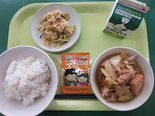 鶏すきはおかわりにたくさん来てくれたのですが残ってしまいました。はりはりづけは減らす子が多かったのに「やっぱりおいしかった!」と言っている子が何人かいました。ごちそうさまでした。(1B)