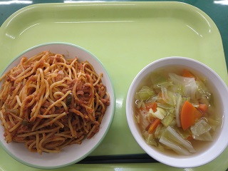 給食準備、ありがとうございました。子どもたちはよくわかっていて、「台風の時と同じメニューだ!」と言っていました。スパゲッティはおかわりがでるほど人気ですが、パサパサ感がダメな子もいました。野菜スープは具の多さに困っている子が多かったです。(4A)