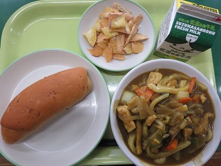 カレーうどん、ベジタブルチップス、どちらも大人気でとてもおいしくいただきました!(4B)