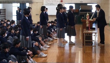 まずは,表彰・伝達。思い起こせば,この1年間,様々な場面で活躍する内部中生の姿がみられました。