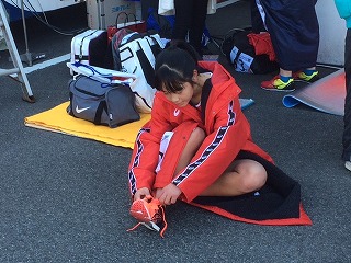 興奮し、あまり良い写真は撮れませんでしたが、左上の写真が、タスキを引き継いだ瞬間です。また、下段の2枚の写真は、走り終えシューズのひもを緩めている岡野さんと走る前にリラックスと集中をコントロールしている木下君です。