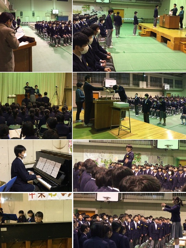 卒業証書授与の動き方の練習。そして,式歌の練習の様子です。