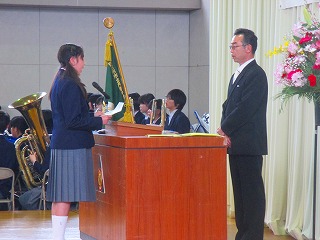 新入生を代表して、伊藤 早来さんから、「楽しみと不安の入学式を迎えた思いの中、勉強・クラブにがんばっていきたい。そして、仲間と分かり合い、思いやりを大切にして、学校生活を送りたい」と言う、力強い誓いの言葉がありました。