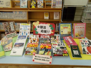 図書室では、毎月、特設コーナーがあります。部活動が本格的に1~3年生がそろうこともあってか、今、「部活動 応援!!」 コーナーが設けられています。