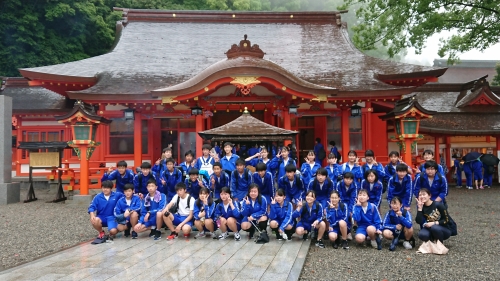 那智の滝にて5グループで写真をとりました。かなりの階段を登ってみんなヘトヘトでしたがいい笑顔です。