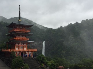 那智大社の塔と滝のコラボです。雨が降っているので霧が立ち込めて幻想的です。
