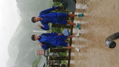 かなりの雨でしたがみんなで滝まで歩きました。雨のおかげでかなりの水量で迫力がありました。