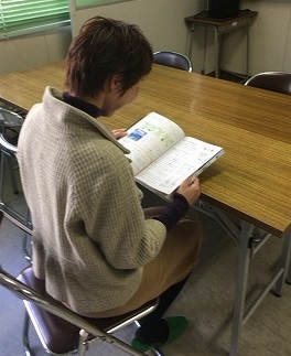 会議室にて,熱心に理科の教科書をみつめる人あり。