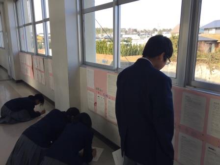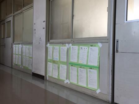 一年生の廊下の様子です。インターネットや、本に載っていないような,現場で働く人の意見や情報を知って自分がやりたい職業や夢を見つけていってほしいです。