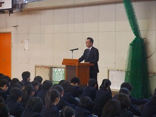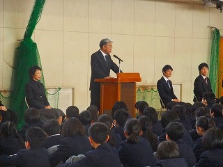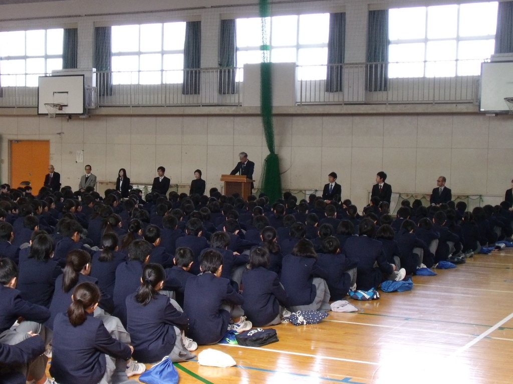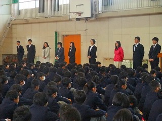 着任式では、新しく仲間入りした11名の職員紹介をしました。「新しい風」の先生方です。代表し、新しい教頭先生から、挨拶をいただくとともに、集会での整然とした生徒の姿や挨拶をよくしてくれると、お褒めの言葉をいただきました。