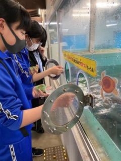 素敵な見学と体験を終え、昼食場所である串本海中公園に向かいます。(写真はウミガメに餌やりをしています)