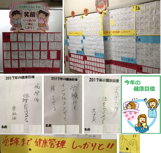 全校生徒が書いた「保健目標」。その中には,受験生を応援する言葉がたくさんありました。