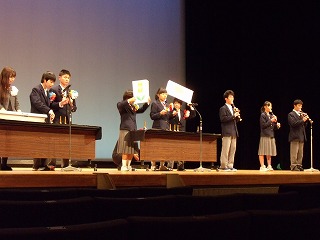 本日、四日市市文化会館で支援学級の発表会が開催されました。この発表会は、市内の各小中学校が一堂に会して、日ごろの成果を披露する場であるとともに、交流の輪を広げる目的で、毎年この時期に行なわれています。本校は、47番目。緊張の中演奏と合唱 !!
