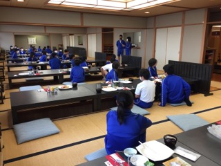 おはようございます。1組凪座敷、朝食会場の様子です。朝食はちょっと控えめの朝のスタートでした。実行委員より、昨日の成果と課題の報告がありました。2日目は、各コースで充実した学習となるように、安全に気をつけて行ってきます。