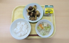 米飯 牛乳 あじとさつまいもの中華炒め ワンタンスープ