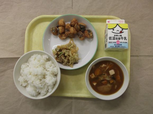 今日は「みえ地物一番給食の日」です。四日市市の給食では,毎月第3日曜日の直前の木曜日と金曜日を「みえ地物一番給食の日」としています。この日の給食は,三重県でとれたものや作られたものを多く使った献立になっています。今日の三重県産の食べ物は,米,牛乳,しいらの竜田あげのしいらと米粉,まこもたけのみそ汁のまこもたけ,エリンギ,豆腐,水耕ねぎ,削節です。「しいらの竜田あげ」のしいらは温かい海にいる大きな魚で,三重県でも夏場に出回ります。白身の魚で脂が少なくさっぱりした味なので,油を使った料理にぴったりです。今日はしいらを酒・しょうゆ・しょうがに漬けこんで,片栗粉と三重県産の米粉をまぶして油であげました。