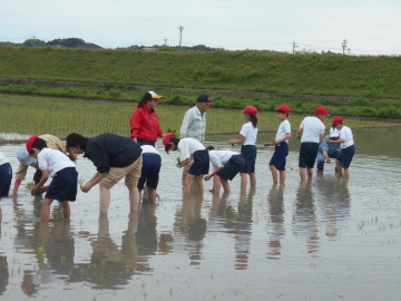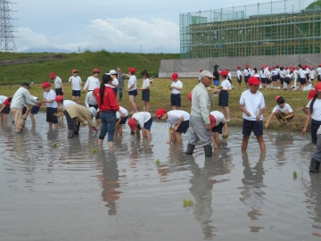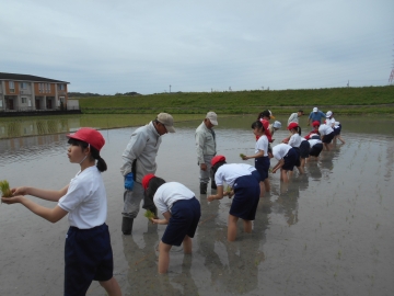 4月24日に地域の方に協力していただき、5年生が田植え経験をさせていただきました。内部農園の方をはじめ、コミュティ・スクールの委員の方など、10人もの地域の方が5年生のために応援に来てくださいました。