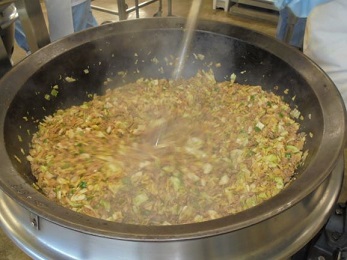 ★今日のホイコーロウにはすりごまが入っています。すりごまはかたい皮を砕いているので,香りが強く栄養の吸収がよいのが特徴です。最初にごま油でしょうが,にんにく,トウバンジャンを炒めて香りを出してから豚肉や野菜を炒めていきました。にんにくは四日市市桜地区で作られたものを使っています。