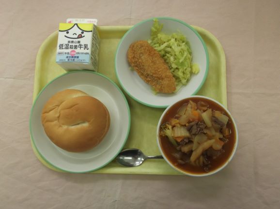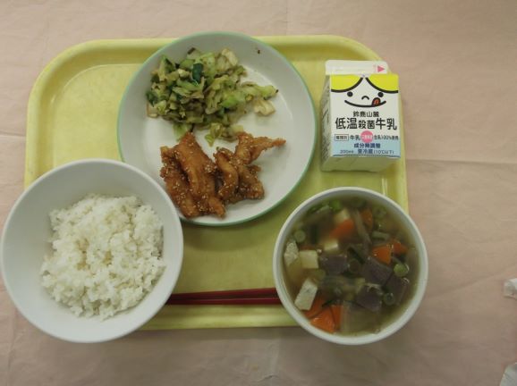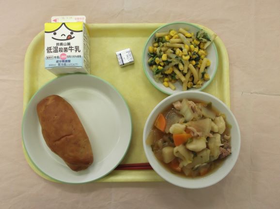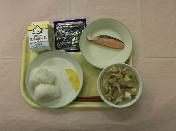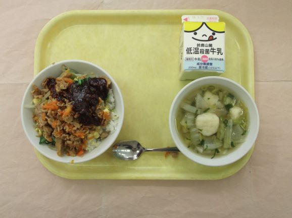 1月21日(月) ビビンバ 牛乳 豆腐団子のスープ 残菜・・・6.5kg  1月22日(火) 米飯 牛乳 鶏肉の南部あげ 塩こんぶ炒め けんちん汁 残菜・・・11kg  1月23日(水) フィッシュバーガー 牛乳 ボルシチ 残菜・・・5.1kg  1月24日(木) ~全国学校給食週間~ <明治22年> おにぎり たくあん 牛乳 さけの塩焼き みそ汁 残菜・・・6.5kg  1月25日(金) ~全国学校給食週間~ <終戦直後> 小型玄米パン マーガリン 牛乳 すいとん 千草あえ 残菜・・・4.8kg  |