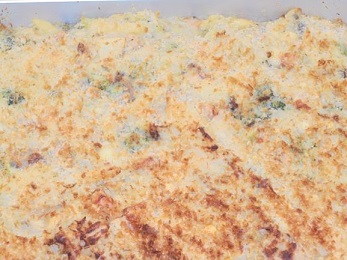 ↑ 今日のグラタンは鮭、玉ねぎ、しめじ、じゃがいも、ブロッコリー、ペンネを豆乳やルウで煮込んで具を作り、容器に具を入れてから粉チーズとパン粉をふりかけます。