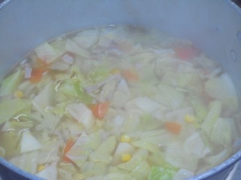 ↑ スープには、ベーコン、にんじん(四日市産 常盤地区)、コーン、キャベツがたっぷりはいっています。