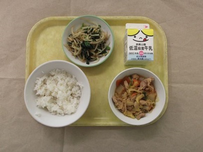 ♢今日は冬野菜をたくさん使った「冬いっぱメニュー」です。鶏すきは鶏肉のほかに,白菜や白ねぎ,こんにゃくなどを使い,砂糖やしょうゆで甘辛く味つけをします。野菜に鶏肉のうま味がしみ込んでいるので,ごはんと一緒に食べるととてもおいしいです!
