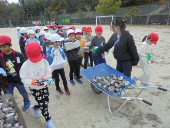 11月初めに収穫したサツマイモを焼いもにして食べました。朝早くから、はげまし隊の方たちが来てくれて、火を焚く準備をしてくださいました。子どもたちも薪を運ぶ手伝いをしました。また教室では、サツマイモを濡らした新聞紙で包み、それをアルミホイルで包む作業をしました。とても大変な作業でしたが、子どもたちはがんばりました。