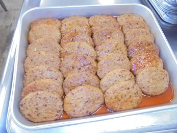 ★今日は調理員さんが,パンに1個1個切り目を入れてくれました。さとう,みりん,しょうゆ,トマトケチャップで作ったたれで煮込んだハンバーグを,パンにはさんで食べました。