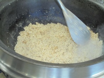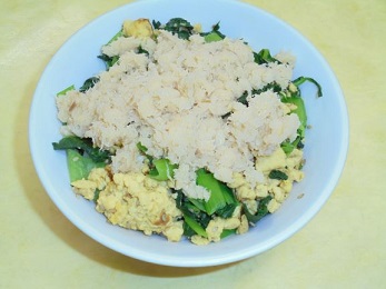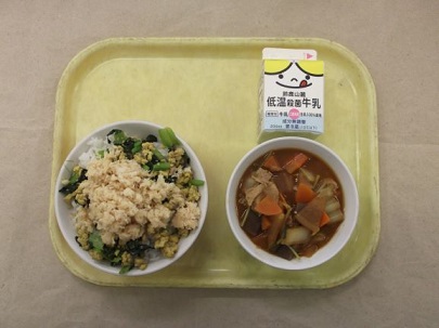 ☆鯛は昔から縁起のよいめでたい魚として親しまれてきました。南伊勢町では、養殖真鯛を一年を通して出荷しています。三重県の海は、海岸が入り組んでいて、静かで水温が高く、真鯛の養殖に適しています。餌に三重県産の海藻やみかん、お茶の葉を混ぜているので、三重真鯛は香りがよく、余分な脂が落ちて、さっぱりしたおいしさになるそうです。今日の給食では、真鯛の身をそぼろ状にして、卵と小松菜を入れて三色丼にしました。