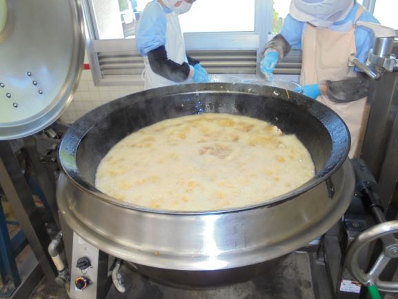 かきあげは,調理員さんが材料を切って,魚のすり身や米粉を混ぜて種を作り,ひとつひとつ形を作って油で揚げて作ってくれています。