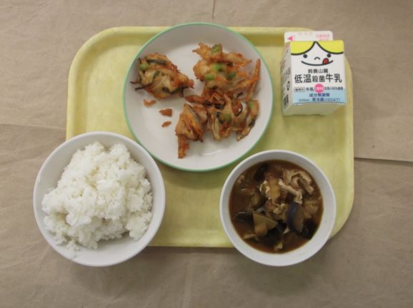 今日のかきあげの具にはごぼう,たまねぎ,にんじん,茎わかめ,枝豆を使っています。ごぼうの風味,たまねぎの甘味,歯ごたえのよい茎わかめが合わさっておいしいかきあげになっています!