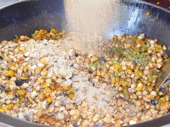 ★今日は粉をつけて揚げたあじと,素揚げにしたかぼちゃ,ピーマンに甘辛いたれとたっぷりのごまをからめました。