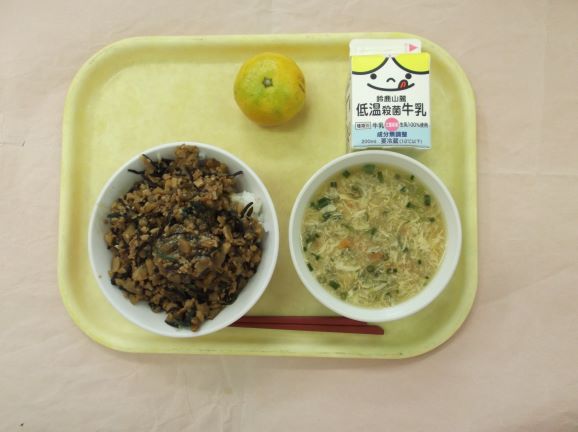 米、豚ひき肉、エリンギ、ひじき、豆みそ、牛乳、削節、豆腐、卵、水耕ねぎ、みかん