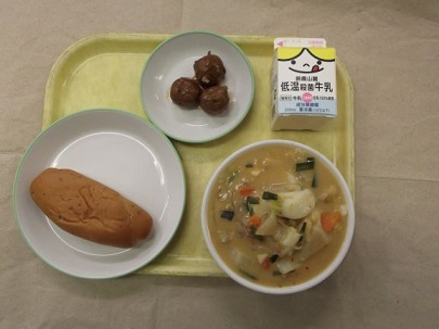 2月の給食目標は「バランスのよい食べ方をしましょう」でした。ごはん、肉、魚、野菜などいろいろな食べ物を好き嫌いせずに食べると、栄養のバランスのよい食べ方ができます。また、今月の献立テーマは「体ぽかぽかメニュー」でした。寒い季節には、根菜類や香辛料を使った料理を食べて、体を温め、病気にかかりにくい体を作りましょう。