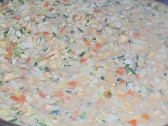 ☆今日の給食では、いかやほたての海鮮に野菜やキムチを入れて海鮮キムチ鍋にしました。キムチには唐辛子が使われているので、体がぽかぽかになりました。