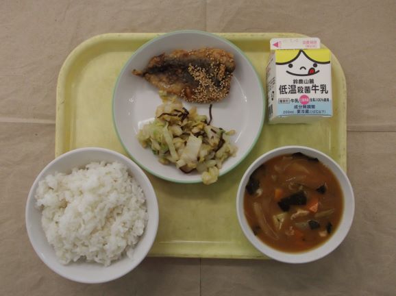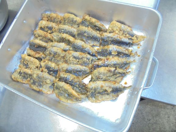 ★今日は,いわしに小麦粉・片栗粉をまぶし油で揚げて,甘辛いたれをからめたかば焼きです。